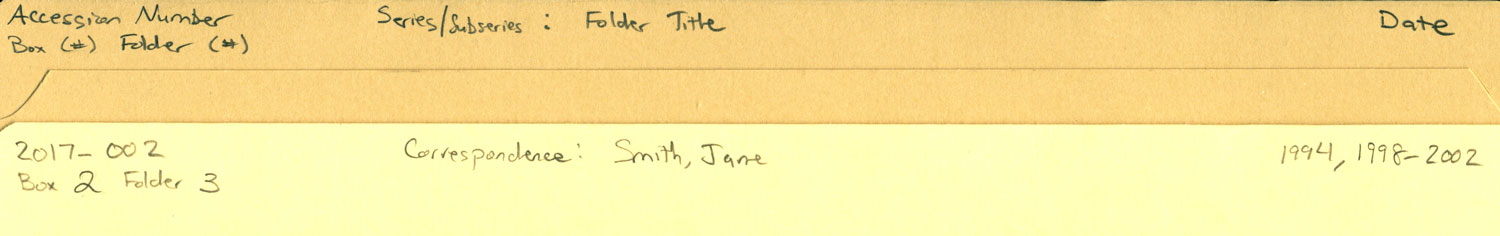 It is important that folder labels are informative and that they look good. Folder labels should be legible and consistent throughout the ENTIRE collection, so that reference archivists and researchers browsing a collection will always know where to find vital information such as the collection name, folder title, date, and box and folder numbers. Properly labeled folders will also ensure that materials are returned to their rightful location within a collection.